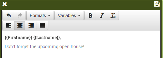 - To personalize the text by including data from the contact list, position the cursor where you want this data, click Variables, and select a variable such as {{Firstname}} or {{Lastname}}.