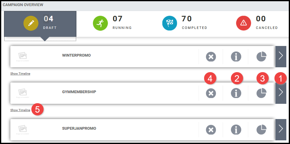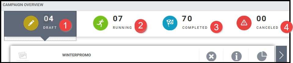 The campaigns listed in the dashboard are the campaigns you, as the the logged-in buyer, created. You cannot see campaigns created by other buyers. DRAFT Campaigns are listed by default. The top of the dashboard shows the number of campaigns you have in each category. Select the tab to show more detailed information for the category: