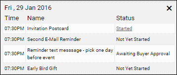 - If you click a circle, a small window opens. If the Status of an activity is Started, you can click Started to open the Order Confirmation page. If an activity is Awaiting Buyer Approval, you can open the campaign, click Launch, and complete the necessary action, for example, click Add to Cart and pay for the activity: