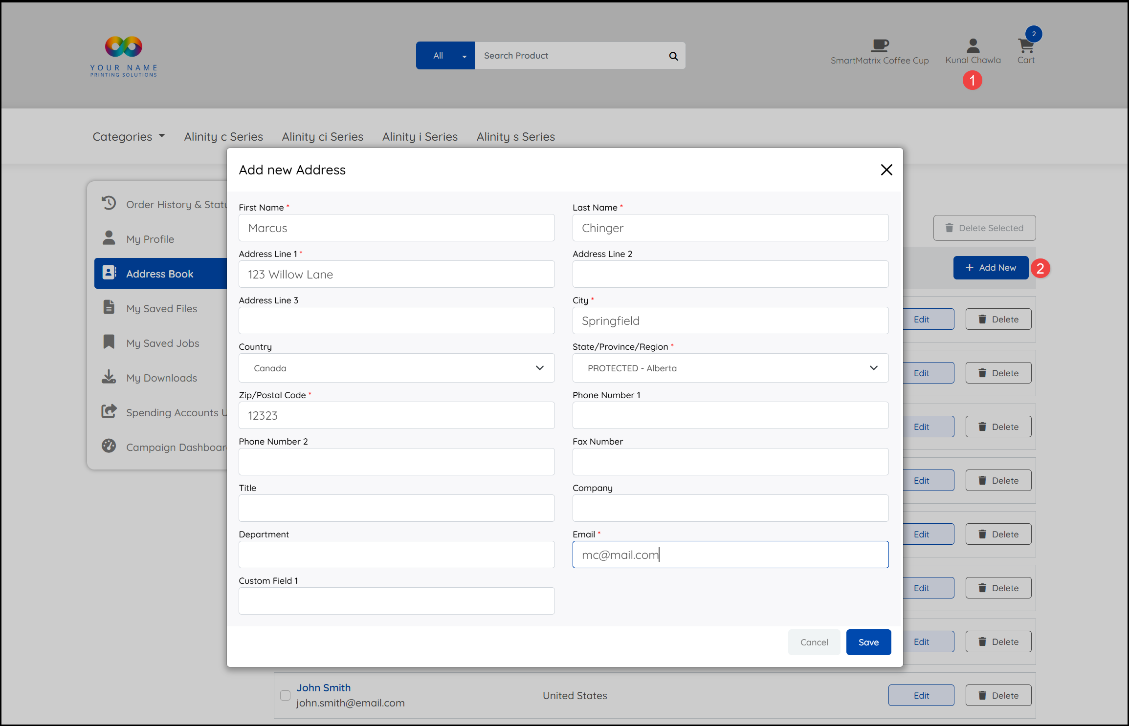 Products may also include an option to populate a product using your Address Book. To add entries to your Address Book, select your Account icon and: