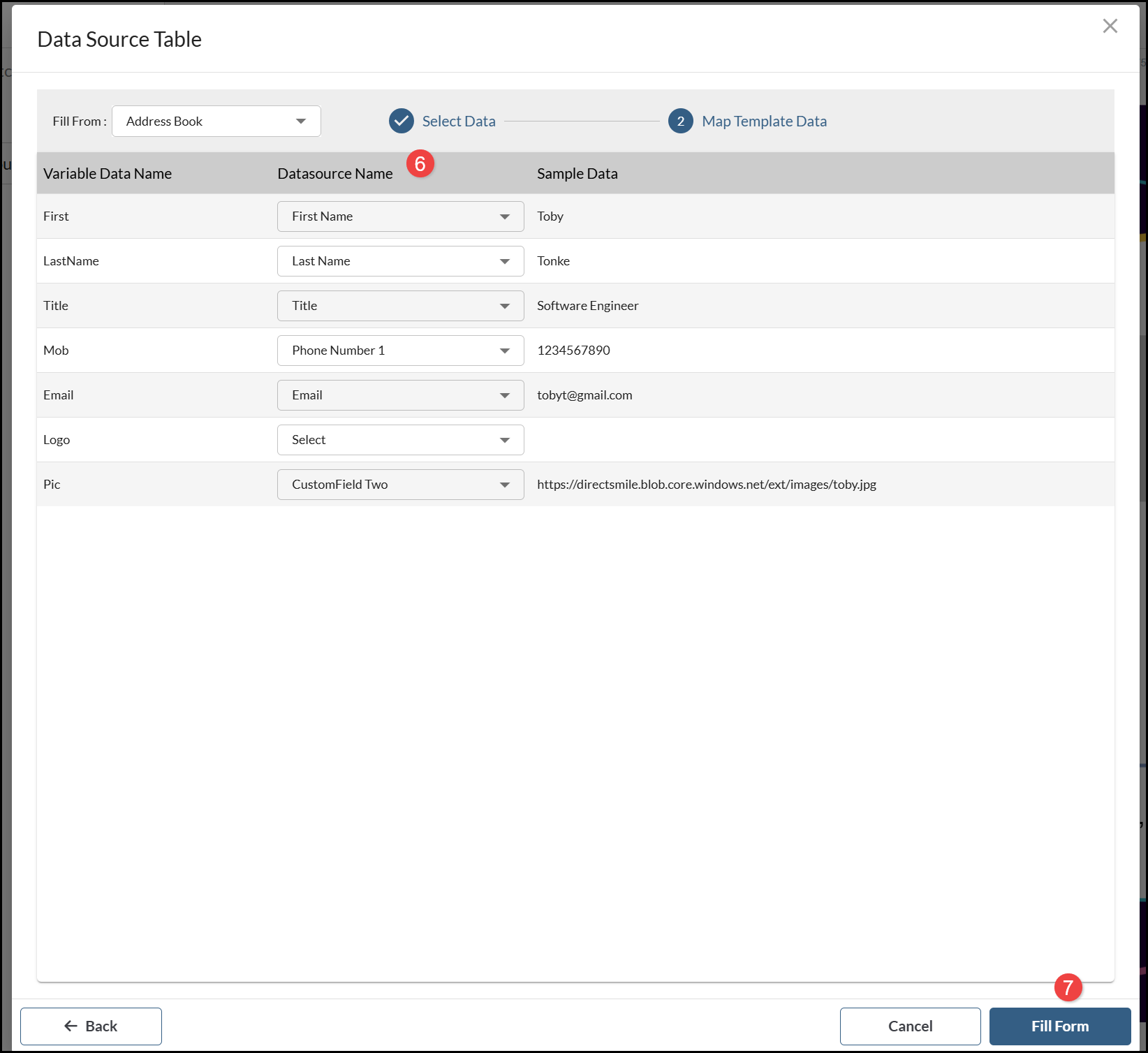 - Select the fields from the Datasource Name menu which Map to each of the Variable Data Name fields. The Sample Data displays the value from the selected record.
